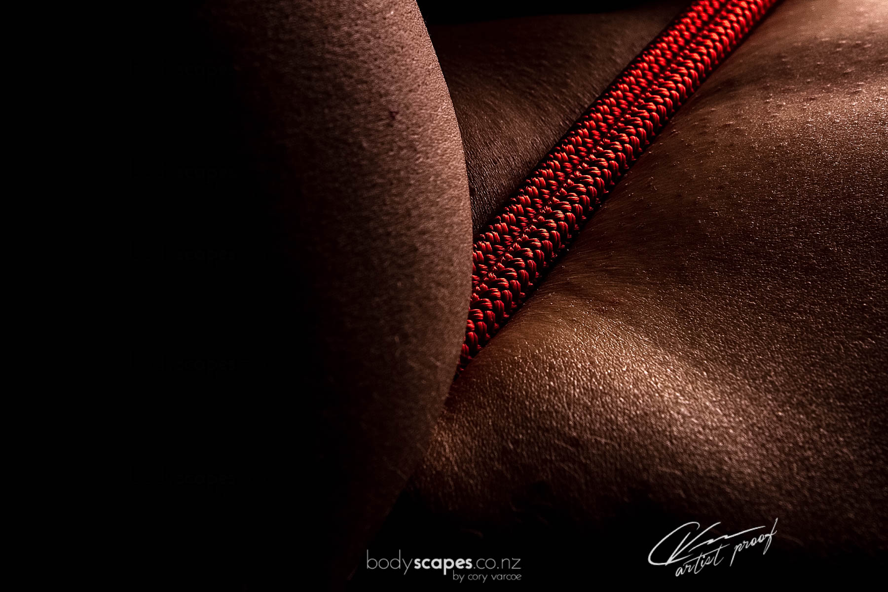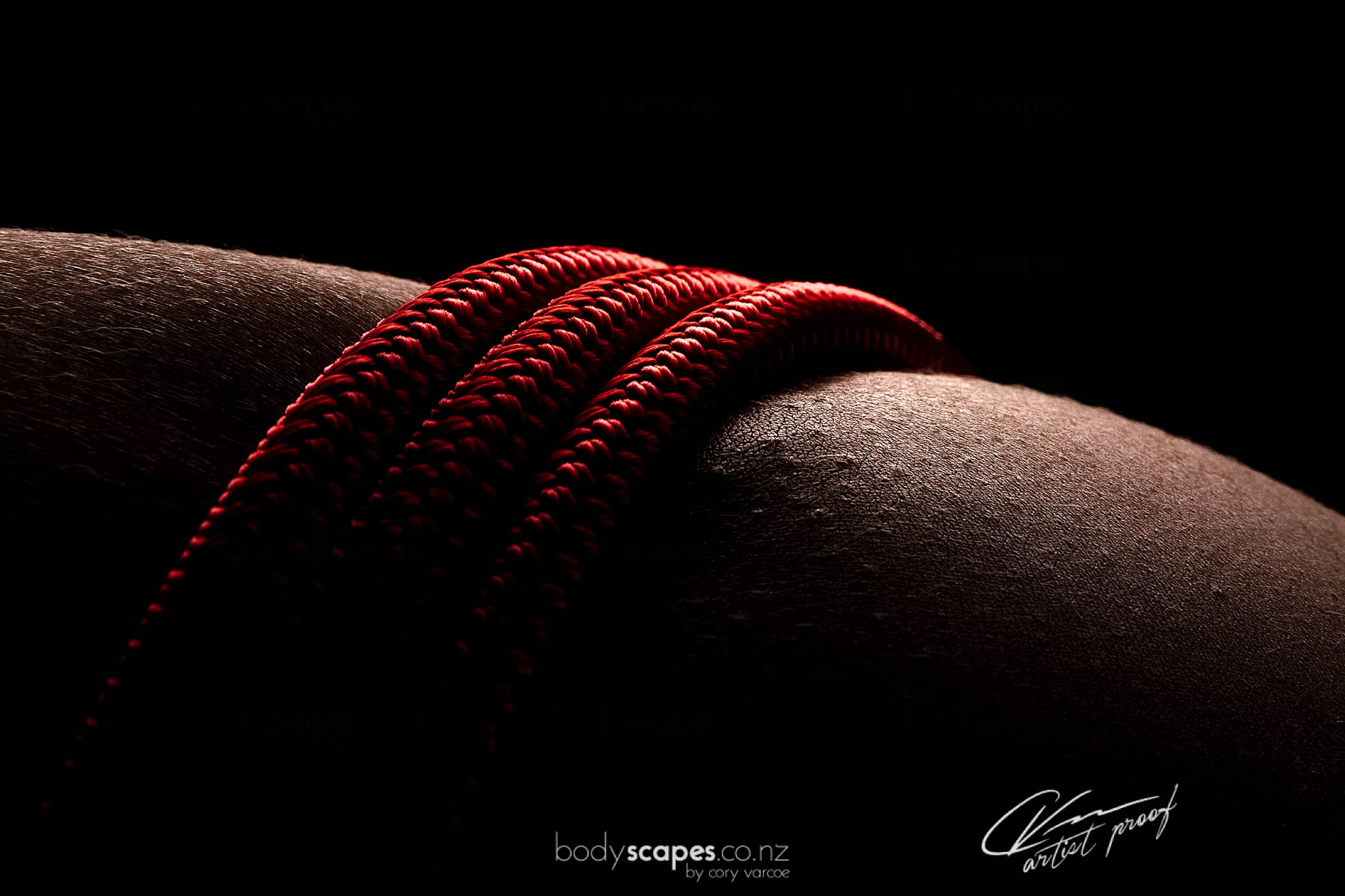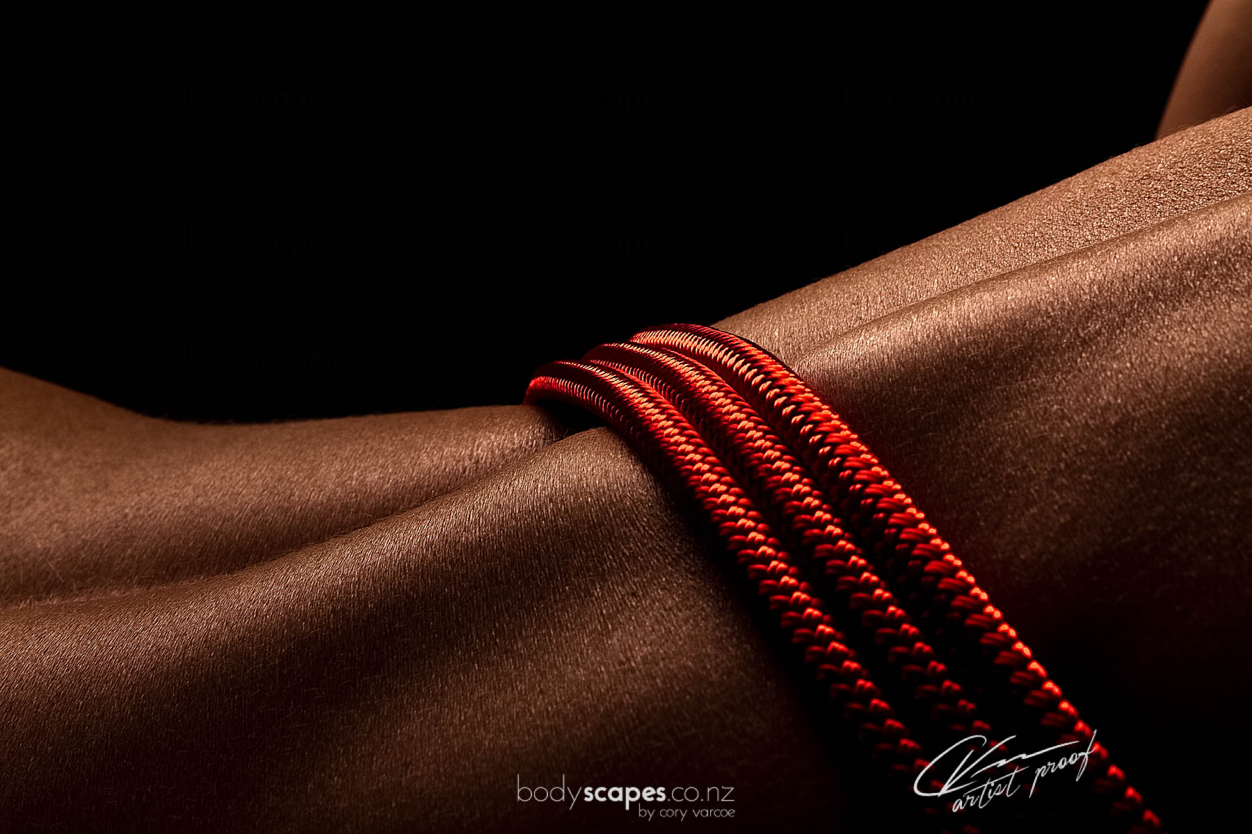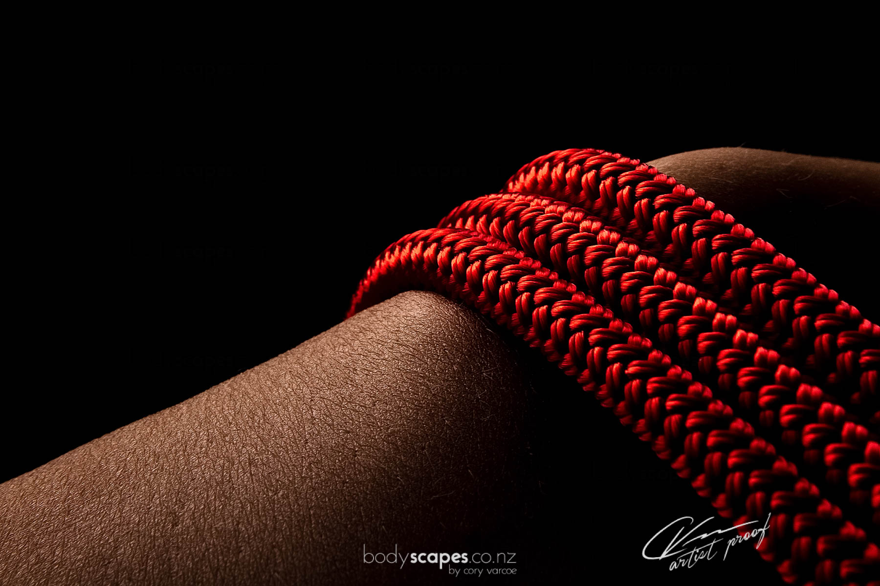 This series of photos uses strands of rope to contrast while complimenting the texture of skin, the rope passes over the skin in striking angles while impressing on it
